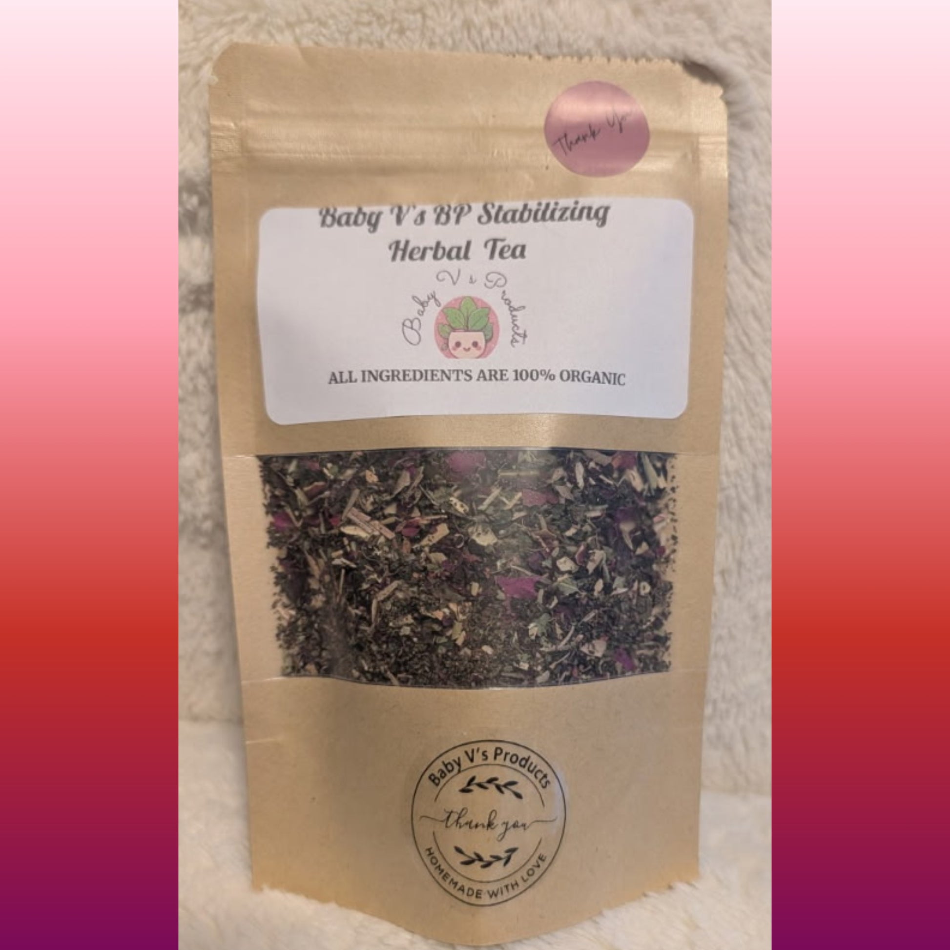 At Baby V's Healthy Alternatives, our High Blood Pressure Stabilizing Tea is crafted to support healthy circulation, heart wellness, and overall balance--naturally. This powerful yet soothing blend features Hibiscus to support healthy blood pressure levels, Tulsi (Holy Basil) to help the body adapt to stress, delicate Rose Buds to calm the nervous system, and Olive Leaf to promote cardiovascular health- just to name a few. Each herb is thoughtfully selected for its traditional use in supporting heart function, circulation, and overall vitality.